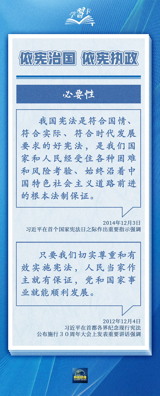 围绕依宪治国、依宪执政,习近平总书记多次在不同场合强调,宪法是党和人民意志的集中体现,丰富和发展了中国特色社会主义法治理论,也为推进国家治理体系和治理能力现代化指明了根本路径和努力方向。一起学习→
