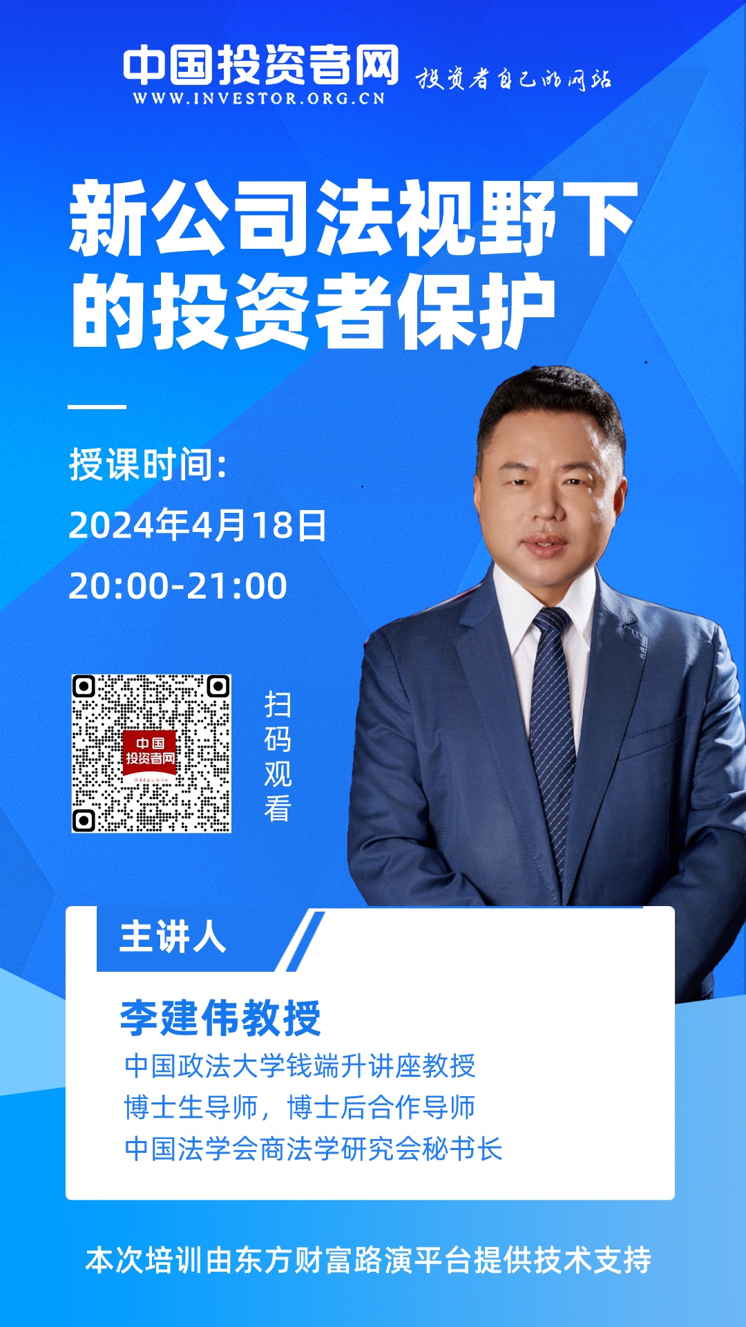 为贯彻落实新公司法与促进投资者保护和服务工作相结合,投资者服务中心将于4月18日20:00-21:00在中国投资者网举办线上培训。培训主题为“新公司法视野下的投资者保护”,授课老师为中国法学会商法学研究会秘书长、中国政法大学博士生导师李建伟教授。敬请关注!
