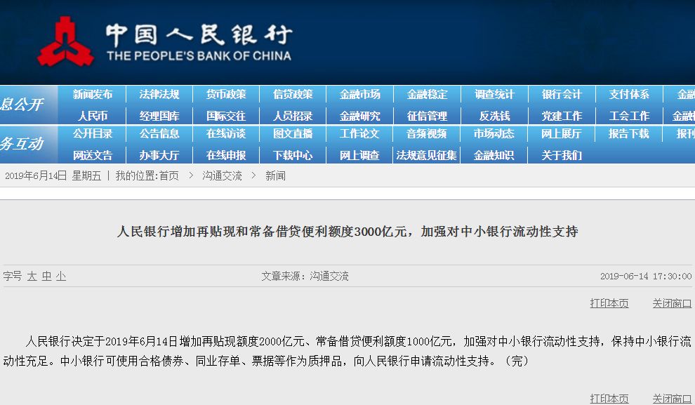 6月14日增加再贴现额度2000亿元、常备借贷便利额度1000亿元,加强对中小银行流动性支持,保持中小银行流动性充足。中小银行可使用合格债券、同业存单、票据等作为质押品,向人民银行申请流动性支持。