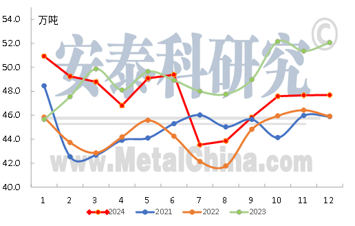 1月份,广西、湖南、内蒙古等地的冶炼厂实现提产或检修复产,抵消了陕西、云南、四川等地个别冶炼厂下调开工率带来的减量,综合考虑春节假期等因素,预估1月份产量将环比增加1.1万吨至48.8万吨,日均环比增加2.3%。