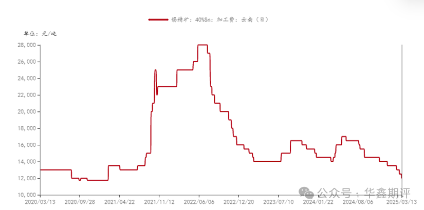 刚果(金)是中国最大的锡矿进口来源国(2024年占中国进口总量的34.22%)。ALPHAMIN的Bisie锡矿停产可能导致中国锡精矿进口受阻, 当前40%品位加工费已下滑至12000元/吨,加剧国内原料紧张局面。