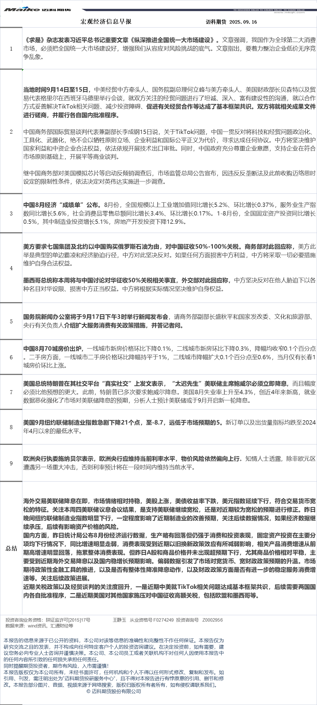 迈科期货9月16日宏观经济信息早报