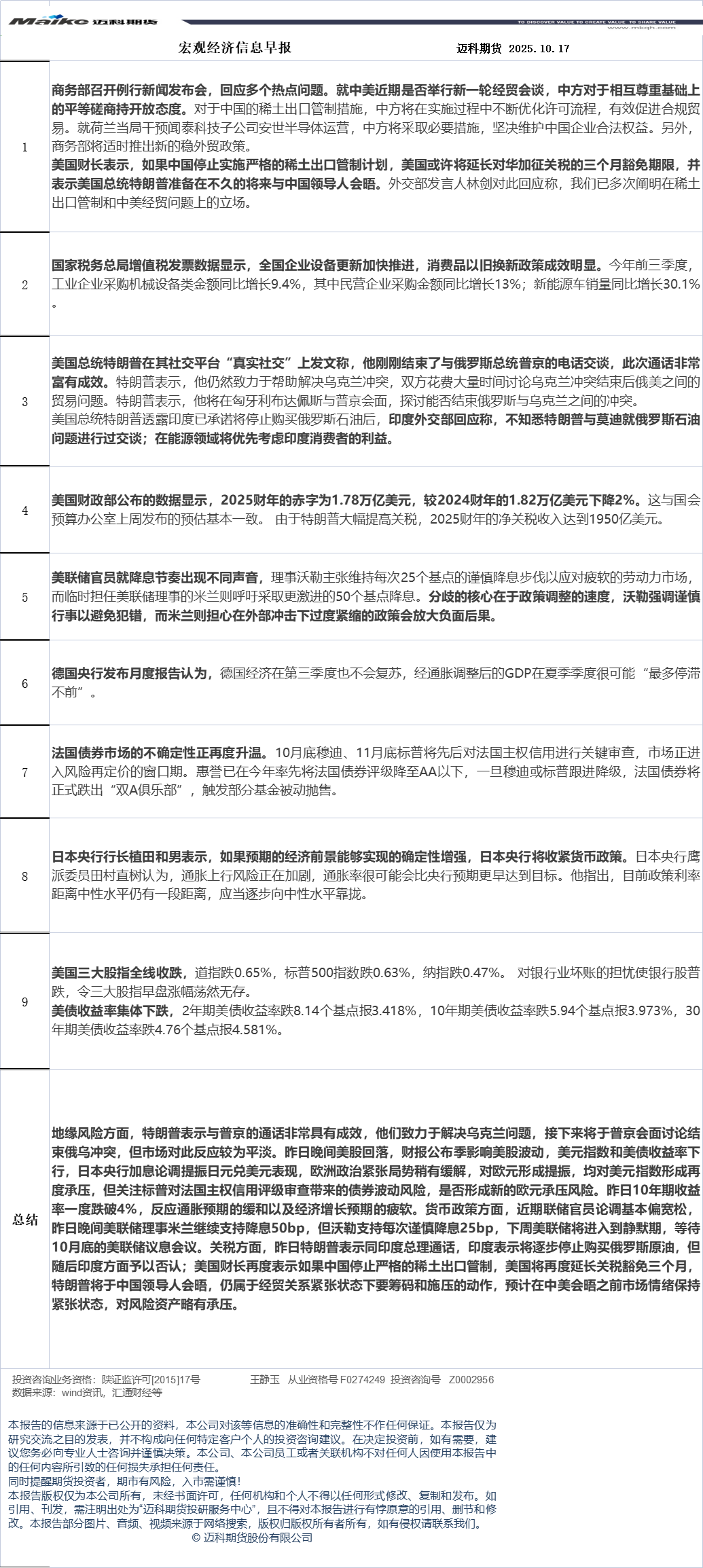 迈科期货10月17日宏观经济信息早报