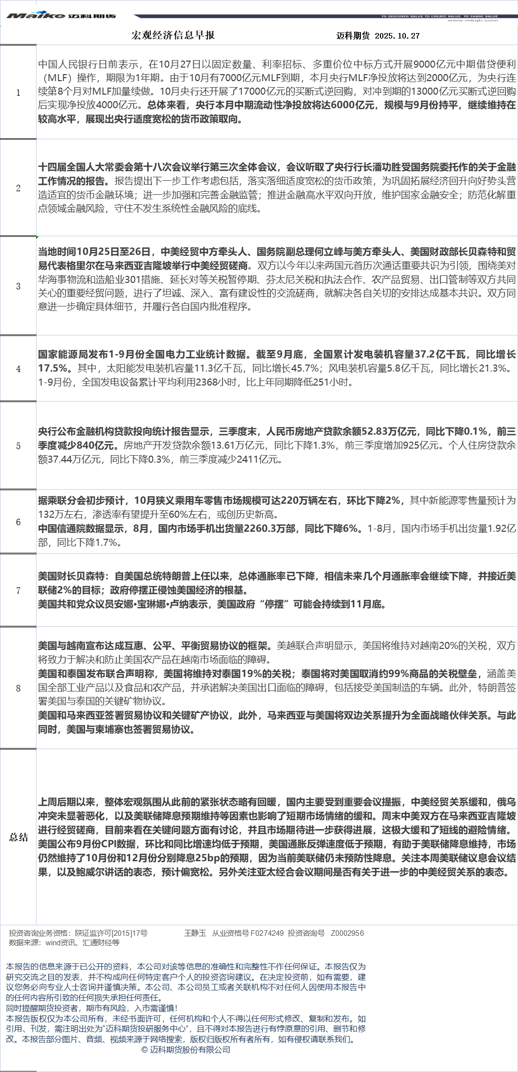迈科期货10月27日宏观经济信息早报