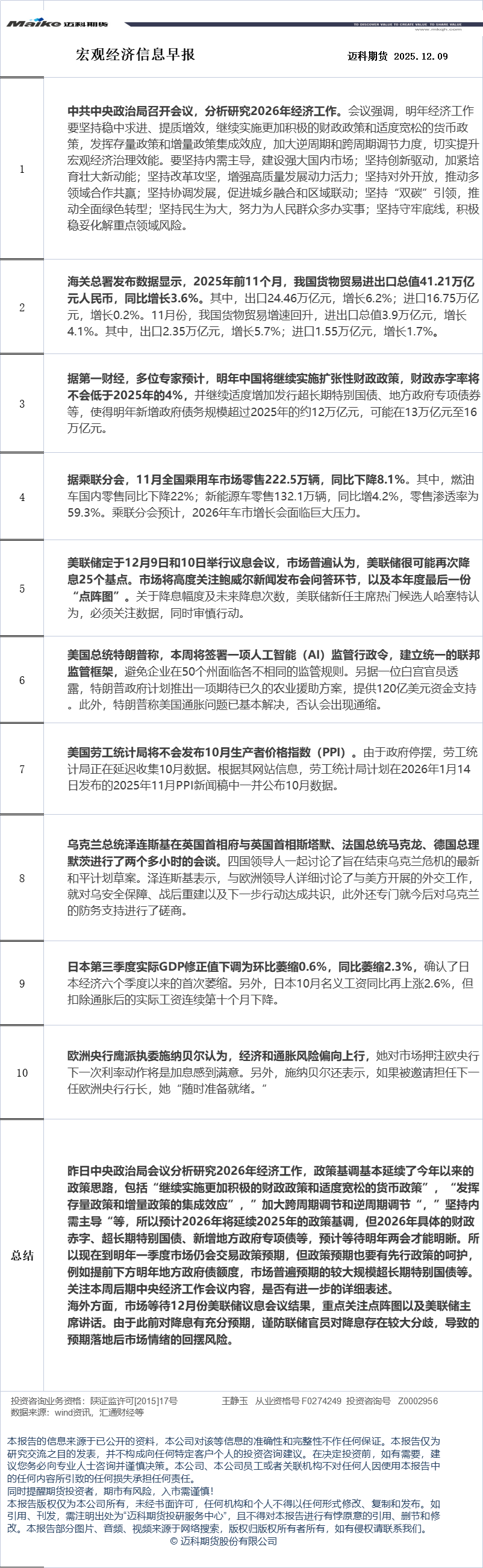 迈科期货12月9日宏观经济信息早报