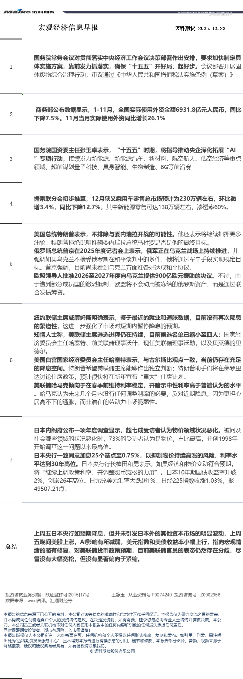 迈科期货12月22日宏观经济信息早报
