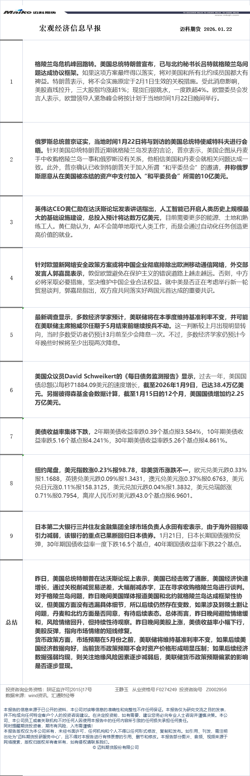 迈科期货1月22日宏观经济信息早报