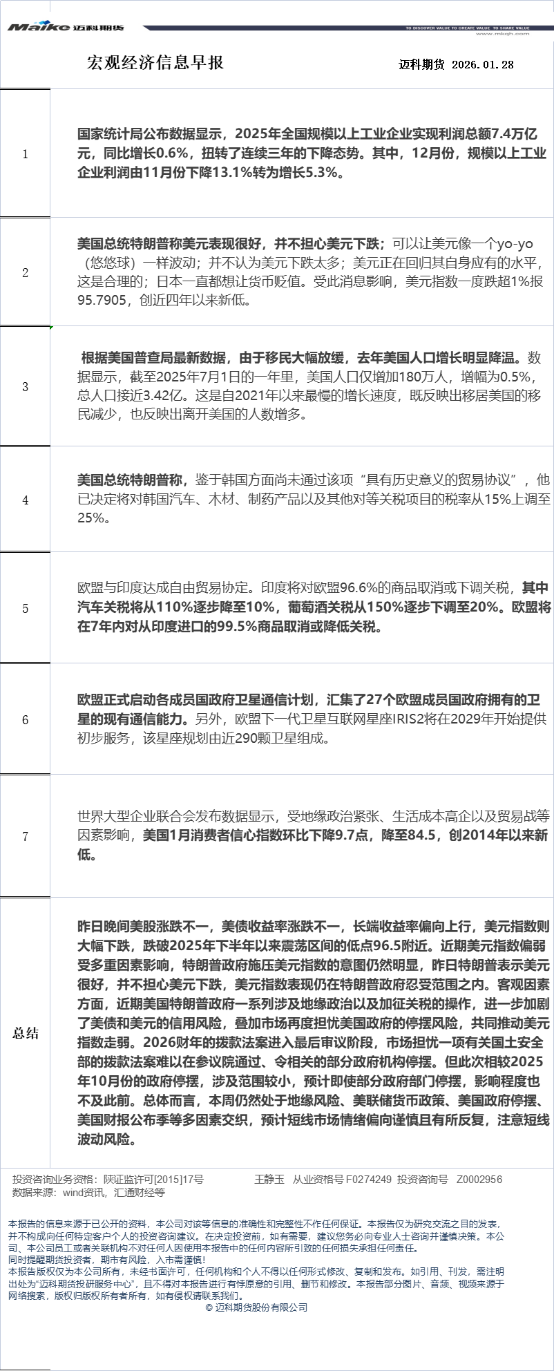 迈科期货1月28日宏观经济信息早报