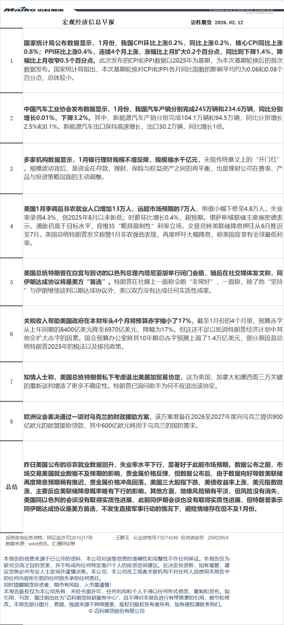迈科期货2月12日宏观经济信息早报