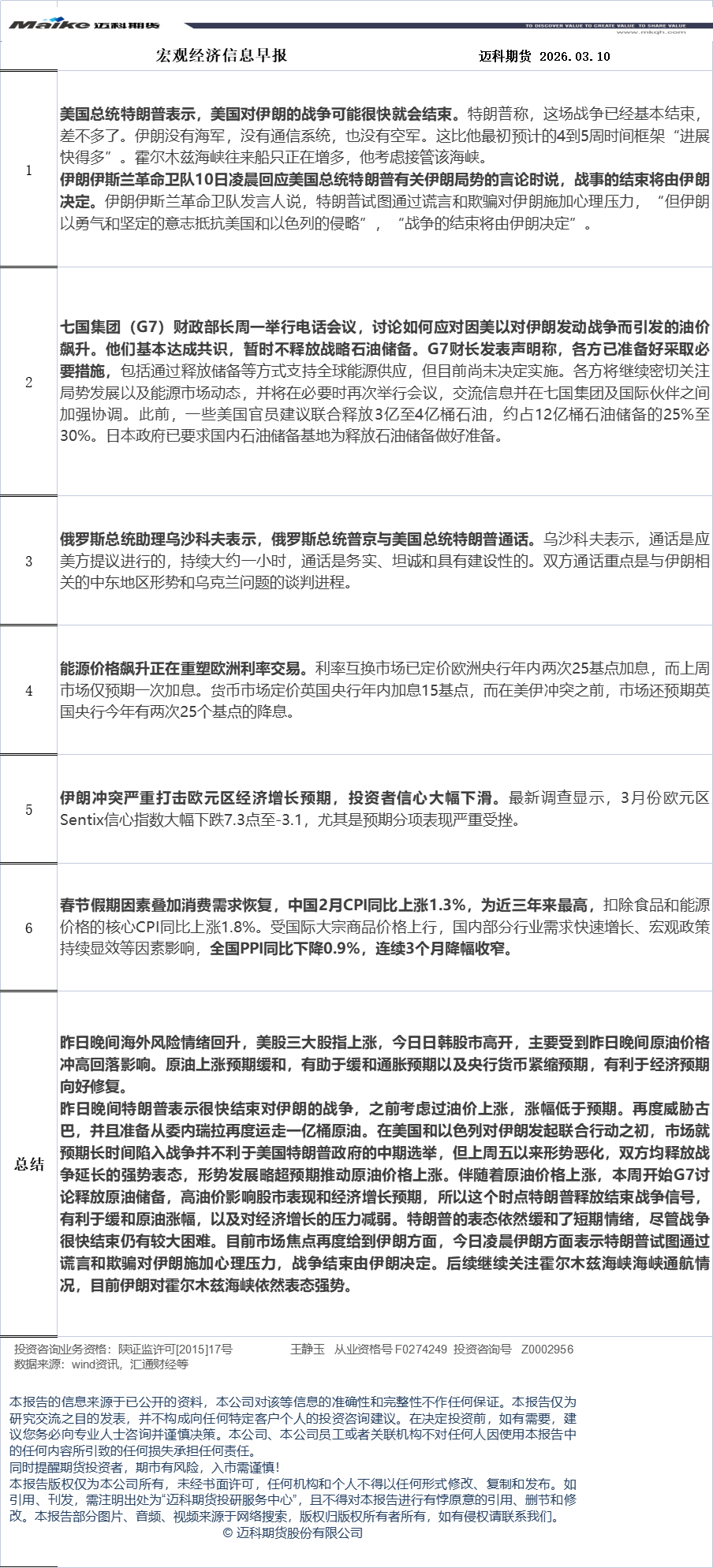迈科期货3月10日宏观经济信息早报