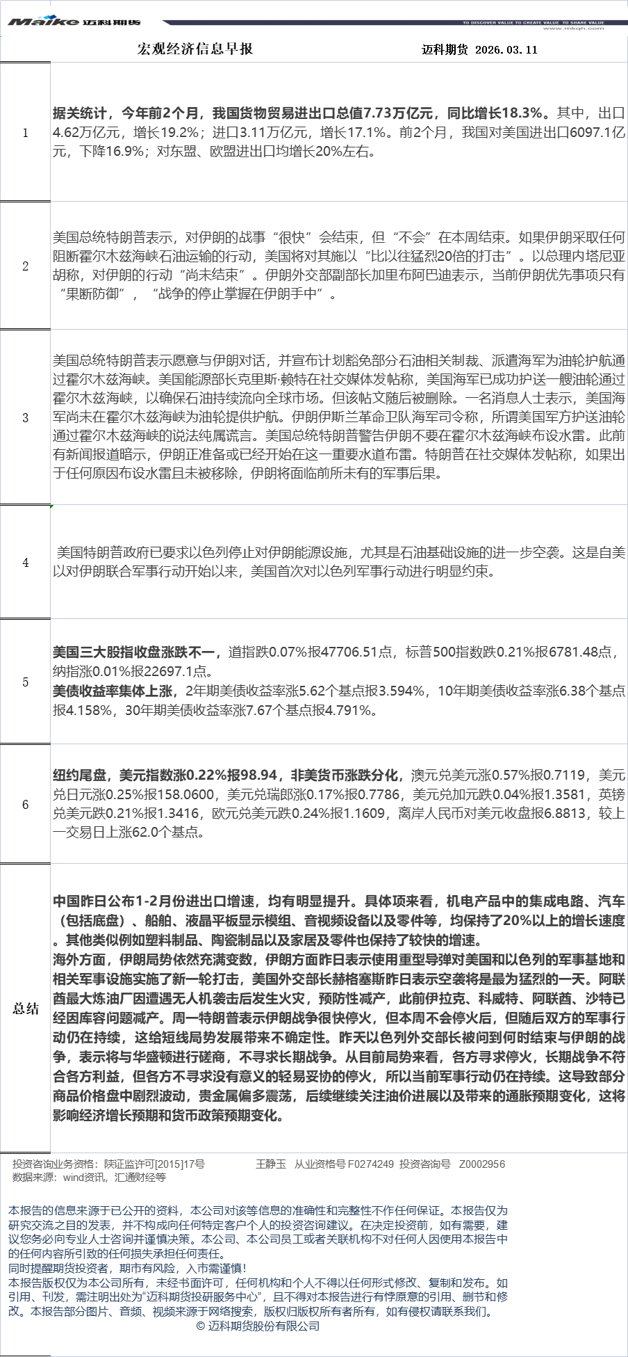 迈科期货3月11日宏观经济信息早报