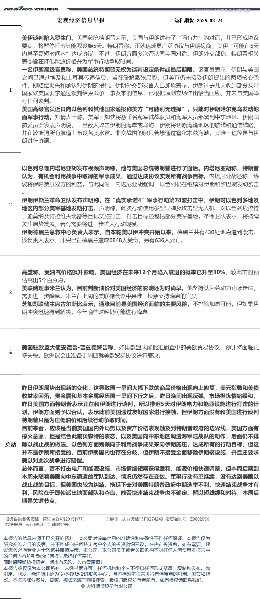 迈科期货3月24日宏观经济信息早报