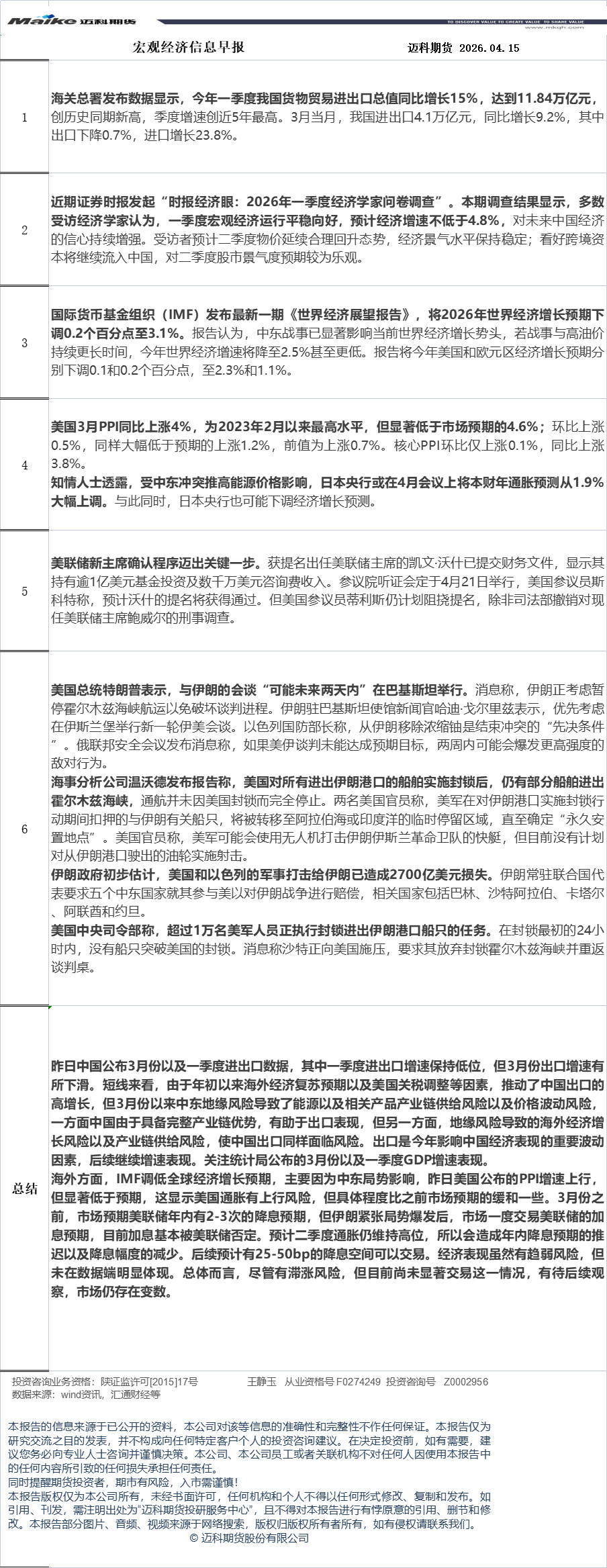 迈科期货4月15日宏观经济信息早报