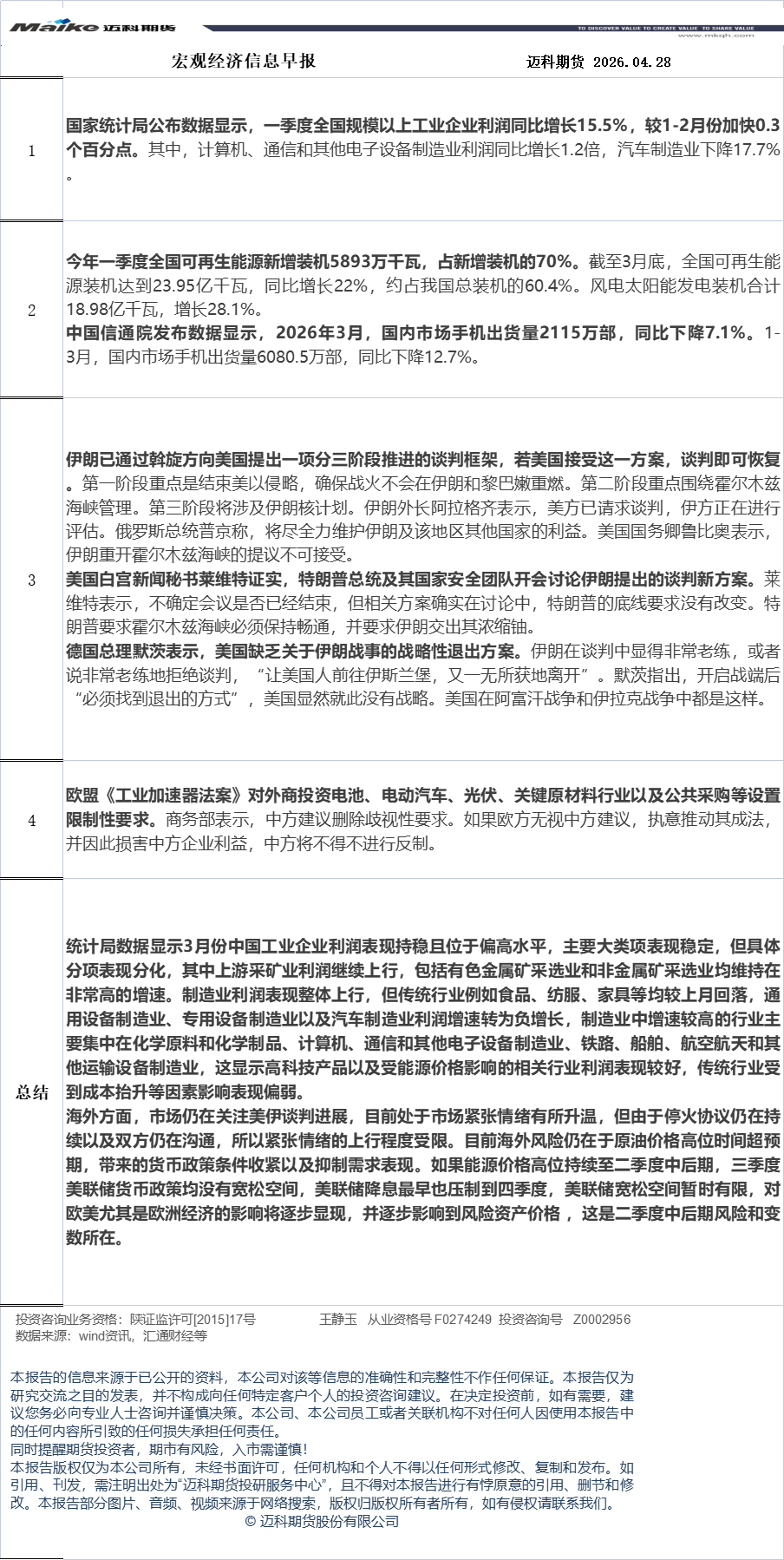 迈科期货4月28日宏观经济信息早报